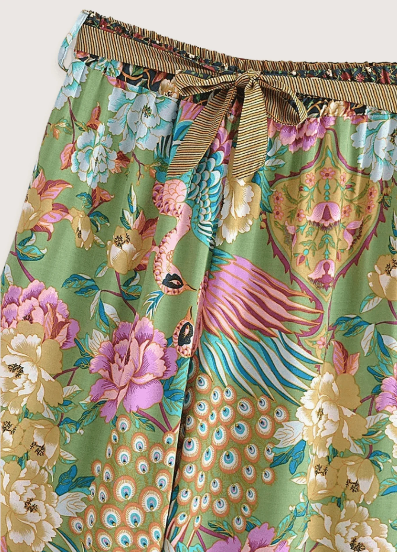 Ce pantalon kimono aux motifs: paon avec plumes, oeil de paon, pivoine, fleurs et bordure japonaise. Le tissu aux couleurs vert sauge aux teintes pistache, turquoise, bleu clair, rose poudré, lilas et beige doré.